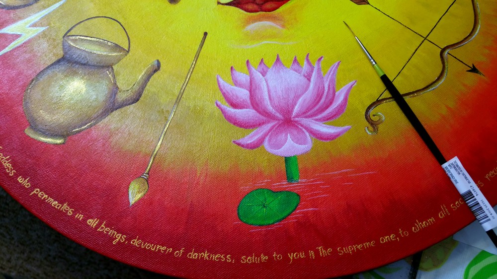 I wrote a part of Aragala stotram in sanskrit language and it’s english translation in the canvas in freehand style with paint brush and acrylic color.