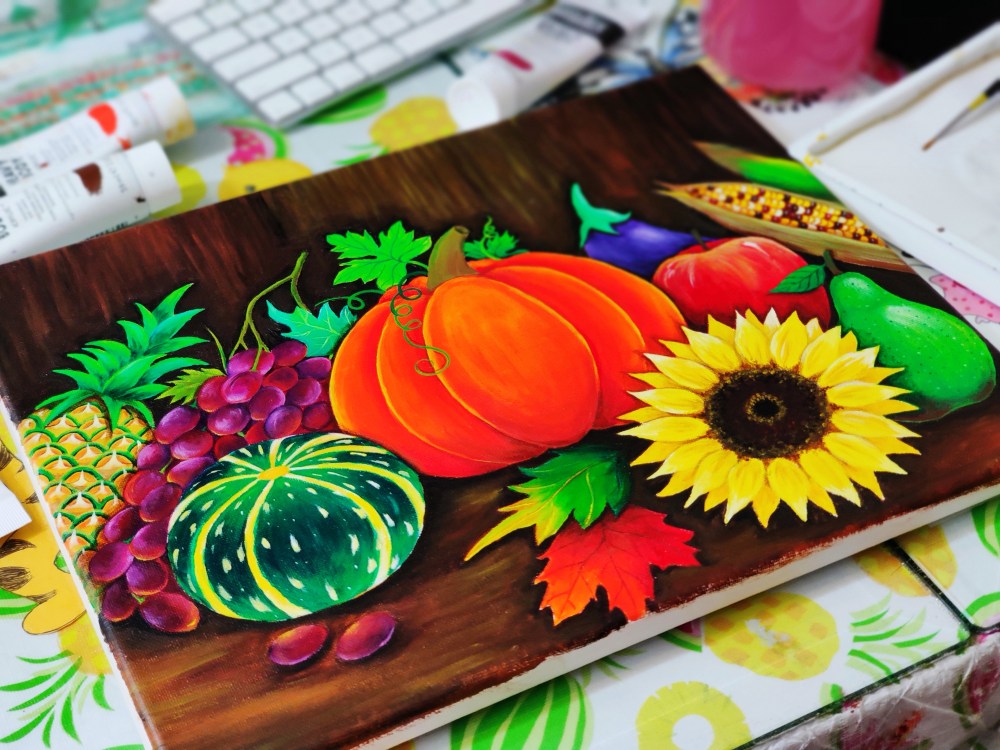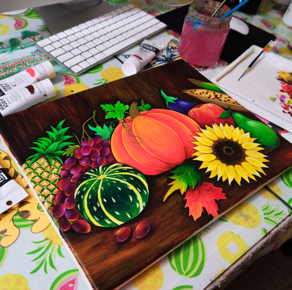 Since this summer my life is full of events and surprises. I had a fun filled summer. Also my new venture as an art teacher kept me occupied and busy focusing on paintings that I designed especially for my students at different levels and age groups. For youth’s art class I planned to design a still life art that will have multiple objects with multiple colors so that it will be good example to teach composition, contrast, layers, color values and also fine strokes. That was the main inspiration behind my painting “Happy Harvest”.My injured foot helped me to complete the painting on time. When finally I had to take a break from my all other responsibilities and had to rest myself I decided to utilize the whole day for painting. My sweet neighbor picked up my son after his school and my husband took responsibilities of dinner and all house holds and that allowed me spend whole eighteen hours to complete my work.