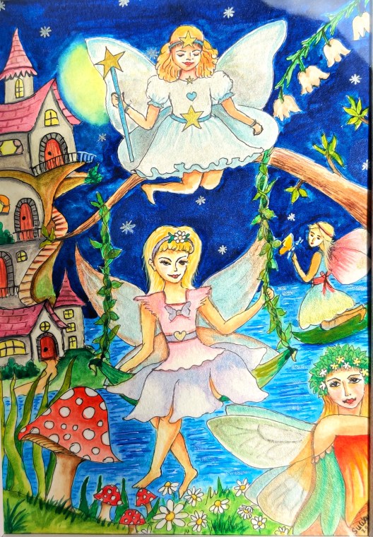 I realized that my biggest fear was what if I fail to make a beautiful human figure with prettiest facial expression. I convinced myself the fact that fairies are humans with magical powers. People around us who brings magic in our lives with their caring nature, they becomes our fairy. They are beautiful with their heavenly heart, mind and soul. Once I overcome my mental block, I came up with a idea for my painting.