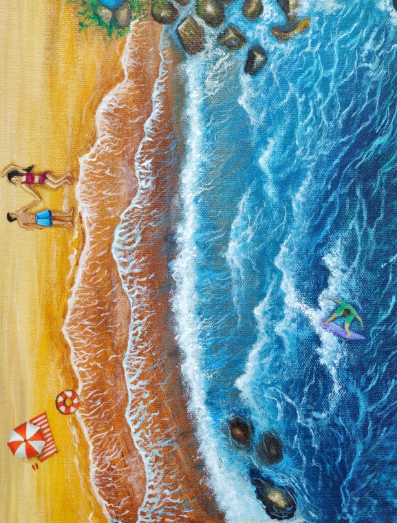 Now incorporating all of them in one view could be possible only if I shift my view point from front to top. The biggest challenge was to constantly reminding myself about the topology point of view every time I was adding a new component to the composition. Honestly at some point I thought of watching youtube videos of other artists paintings seascape, but then I dropped that idea as I didn’t want to influence my very own organic painting style. I spent a lot of time to study the sea from my previously taken photographs. For a couple of elements like yacht, sailboat I used some reference photos from internet. For the human figures, I asked my kids and husband to give pose and took photo from upstair loft.