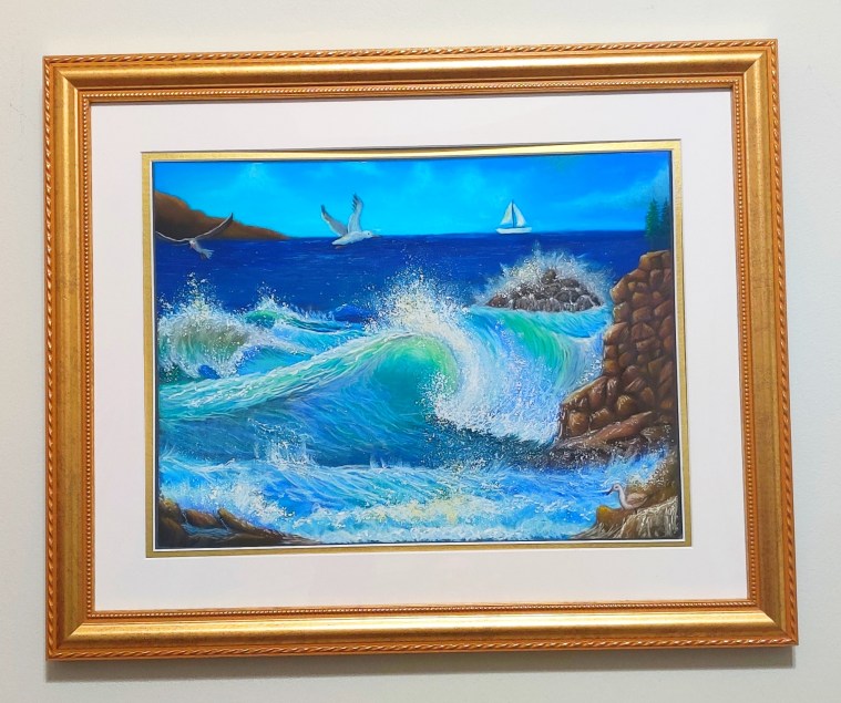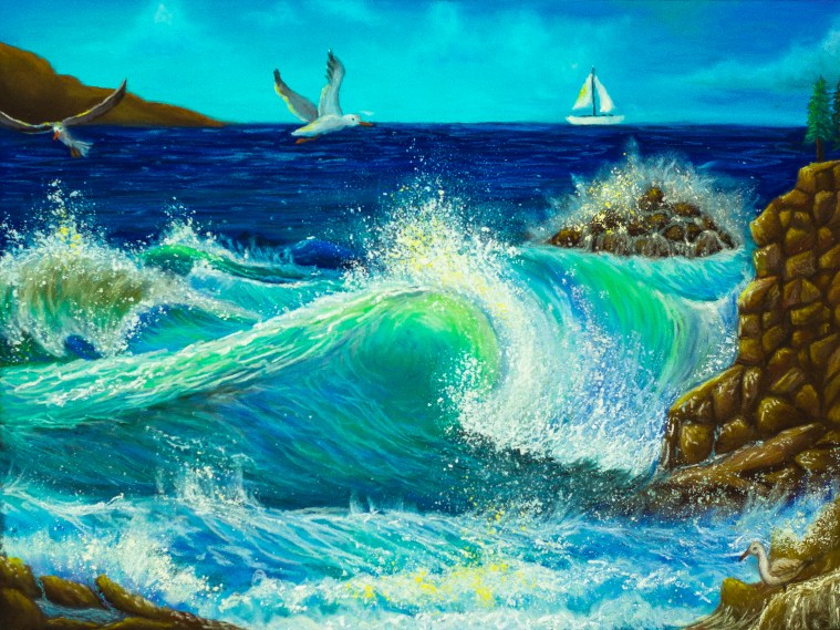 What attract most of us to a coastline trip is the sound of waves and the visuals of big waves who never fear to crash the shore and dis-integrate as if they know their inner power to stand up again and again just like our lives and what experience teaches us is to never fear to fall, because if you fall, you can rise again. I tried to bring my experience to the canvas after visiting Acadia National Park’s sand beach.