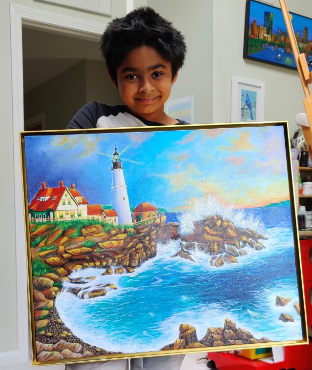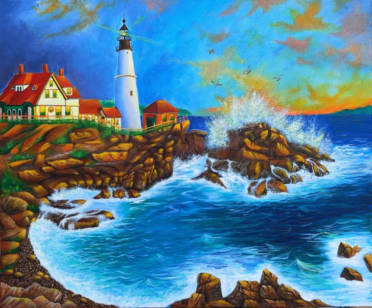 While returning from the Acadia National Park in Maine, we went to Portland Head Light house almost at their closing time. The setting sun, orangish sky, reflections of the golden rays on the rocks and windows created a magical environment around me. The breathtaking view of the moment when a big wave crashed into the rock, blew my mind away and that moment I decided to tell the story of my heavenly experience through paint and brush.