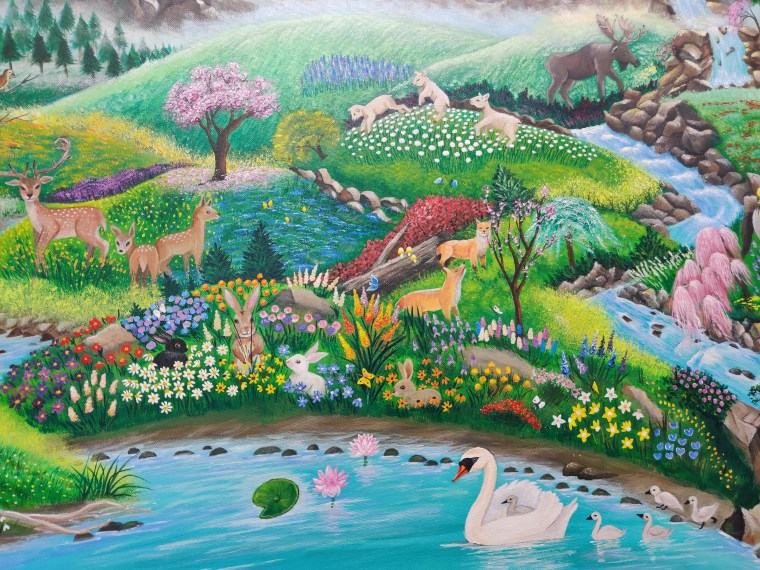 That painting is huge in the whole concept and size. I had to brainstorm to give a real face of my dream. I had to tickle my sleeping mathematical brain to calculate the sizes of every elements (so that no one’s existence should over power the others) , their positions, the bushes, the colors of flowers (so that one set of warm or cool color should not dominate one particular area). I had to establish a balance between my heart and mind because what I imagined was in a 3d space and