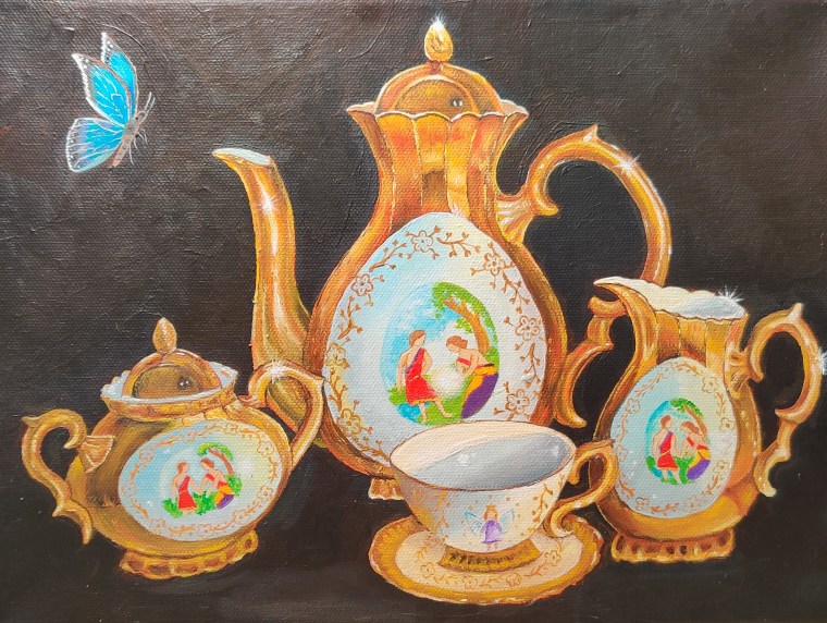 A Bavaria 24 k gold plated teapot set was my last year’s catch from antique auction and I have finally utilized my purpose on the painting