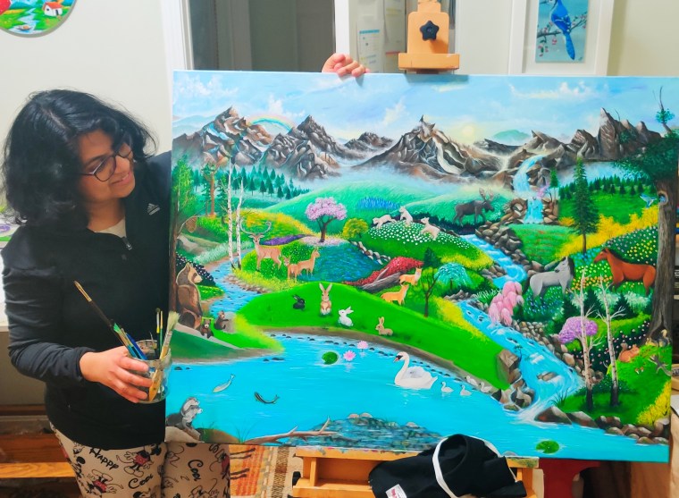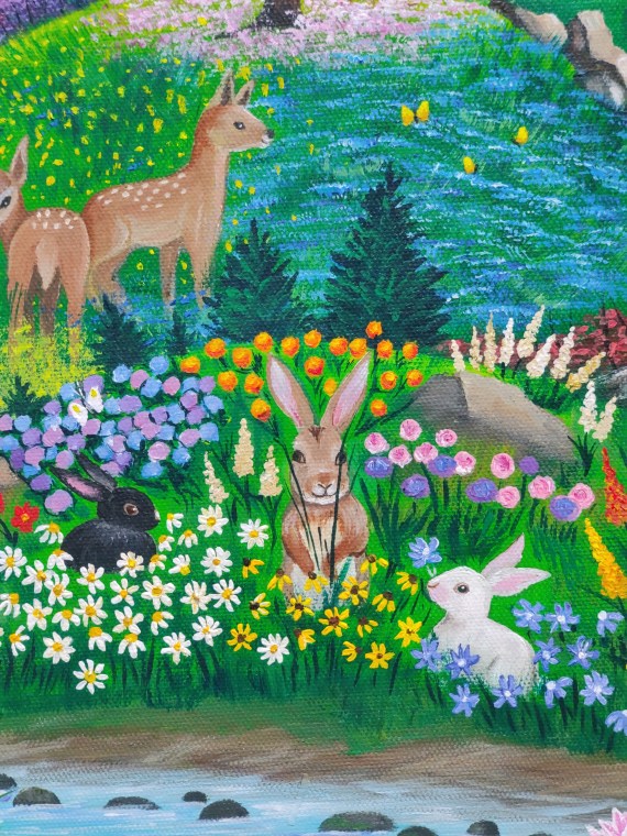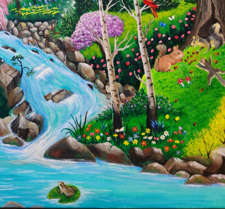 I had to choose colors very cautiously maintaining a balance between warm and cool hues It has to look organic, but one should not dominate the other. Every color, every tree/bush, flowers, every members of the happy family are co-existing and contributing to the mind-soothing view in my canvas.
