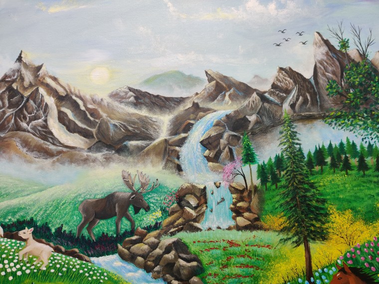 I started creating the background of the story: The bright sky, fluffy baby clouds, morning cosy smiley sun, the mountain range who is waking up uncovering herself from the snowy blanket, cool breeze, joyful and unstoppable streams of waterfall, trees, bushes, flower gardens, a happy little mountain lake,